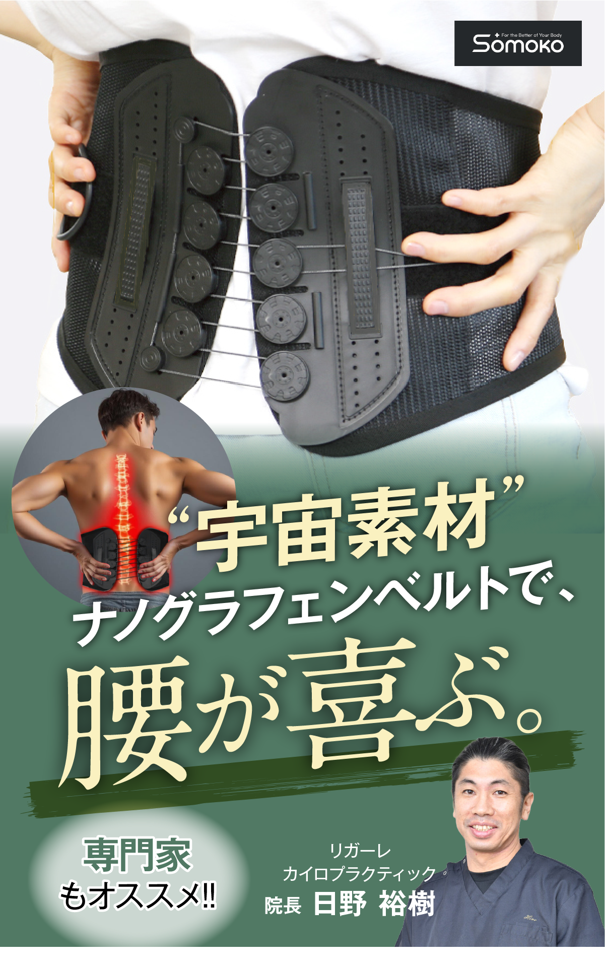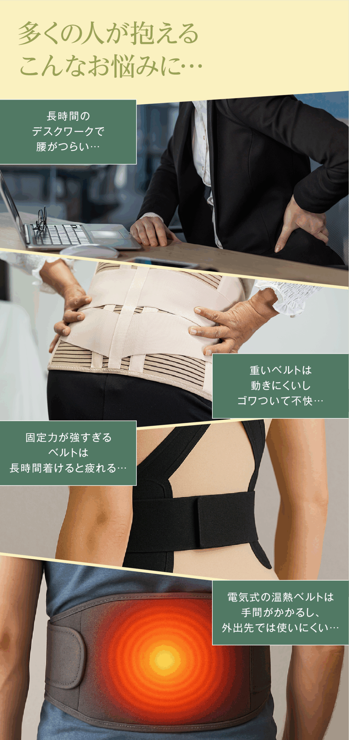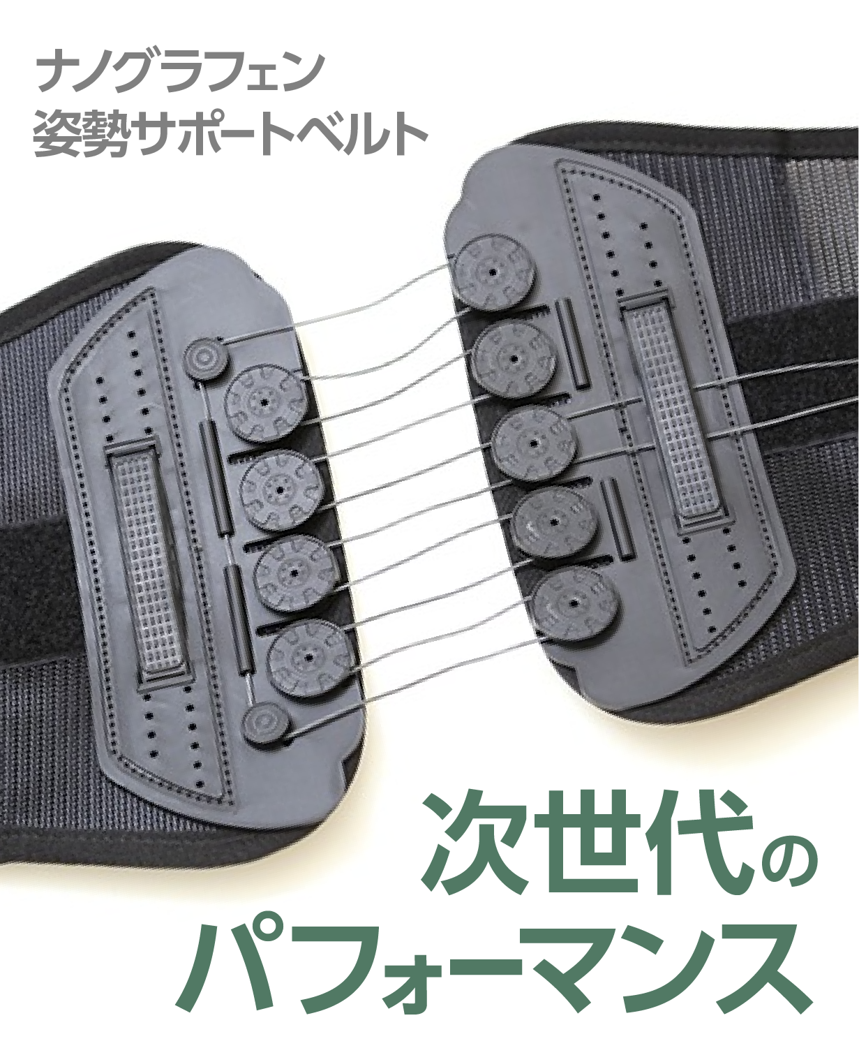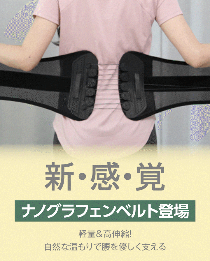 ナノグラフェン姿勢サポートベルトなら、グイっと締まるのに動きやすい!電気を使わずに体温でじんわりと温かくなり、腰を優しくサポートします。