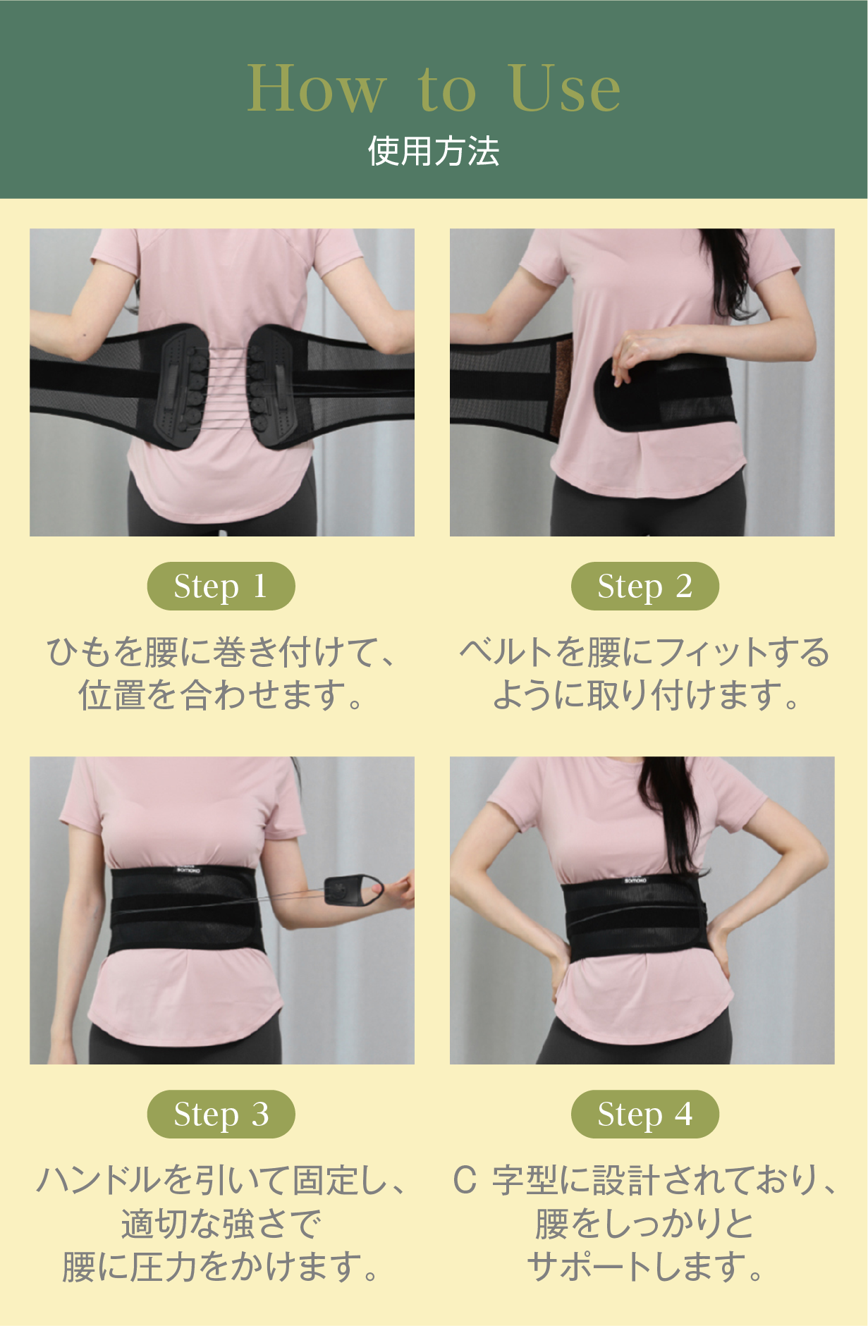 滑車式で圧迫感を微調整できるため、体の形にぴったり密着させ、違和感なくしっかりと腰まわりを固定できるため、日常生活・デスクワーク・食事中など、ご使用するシーンに合わせてサポート力をコントロールしてご使用できます。